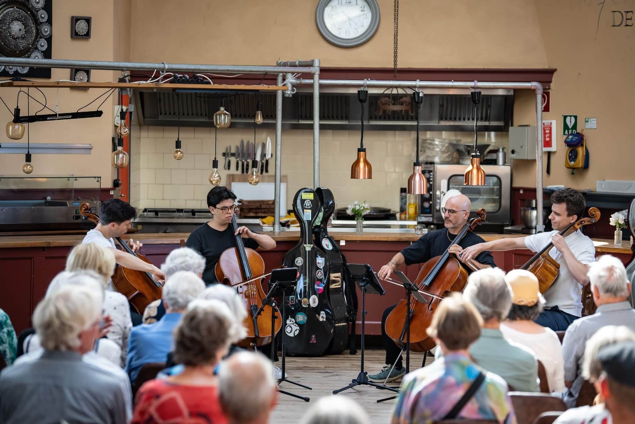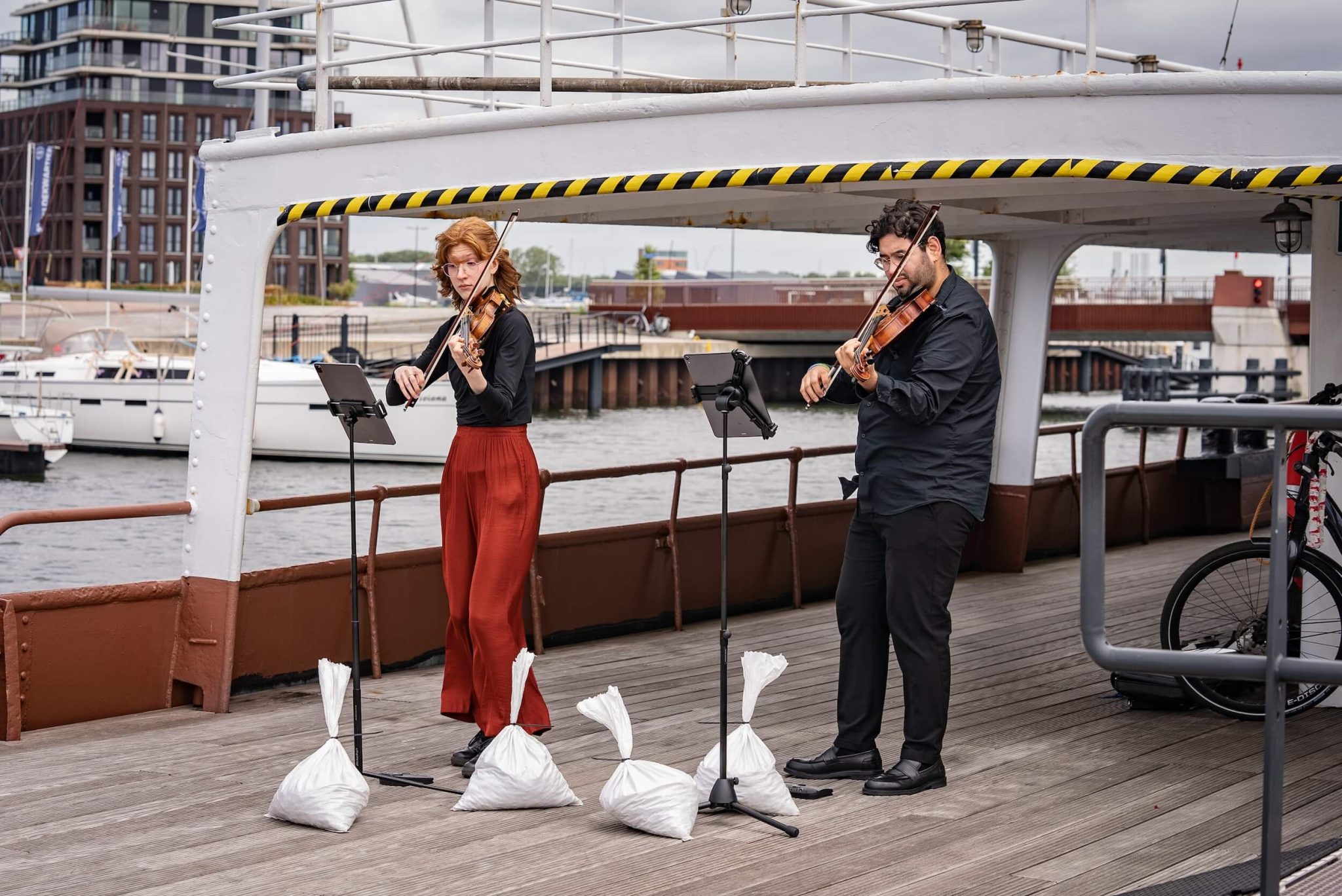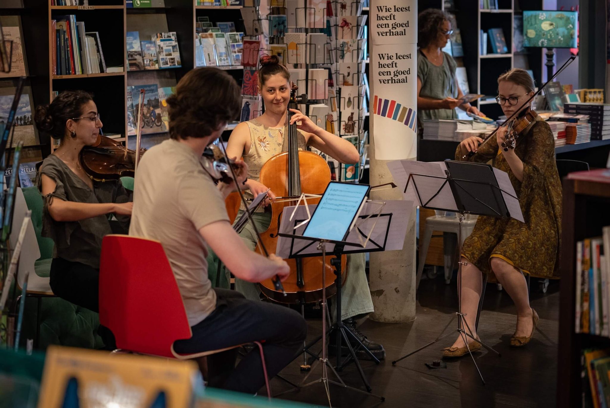 On June 28, we were at two locations in Vlissingen with free pop-up concerts by the musicians of the Zeeland Klassiek Festival. On the old Queen Emma ferry, the duo Zala Frangez & Wilker Paredes played music by Martinu, and in the Spui bookshop, the ISLE Quartet played.