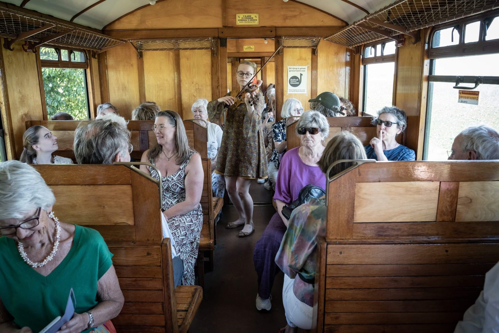 The day started with a concert by the IKARAI ensemble in the warehouse at Goes station. Then we took the steam train from Goes to Hoedekenskerke, with concerts on the train. Upon arrival in Hoedekenskerke, there was a concert by the ISLE ensemble in the church in Hoedekenskerke. Then we took the train back to Goes with more performances on the train and finally a performance by four Festival cellists in the warehouse at the station in Goes. It was a special festival day for an enthusiastic audience.