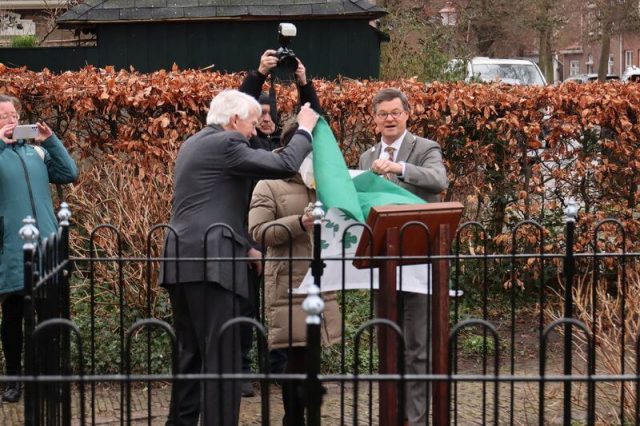 Na de bedankjes zijn we naar buiten gegaan en heeft de burgemeester het informatiebord onthuld.