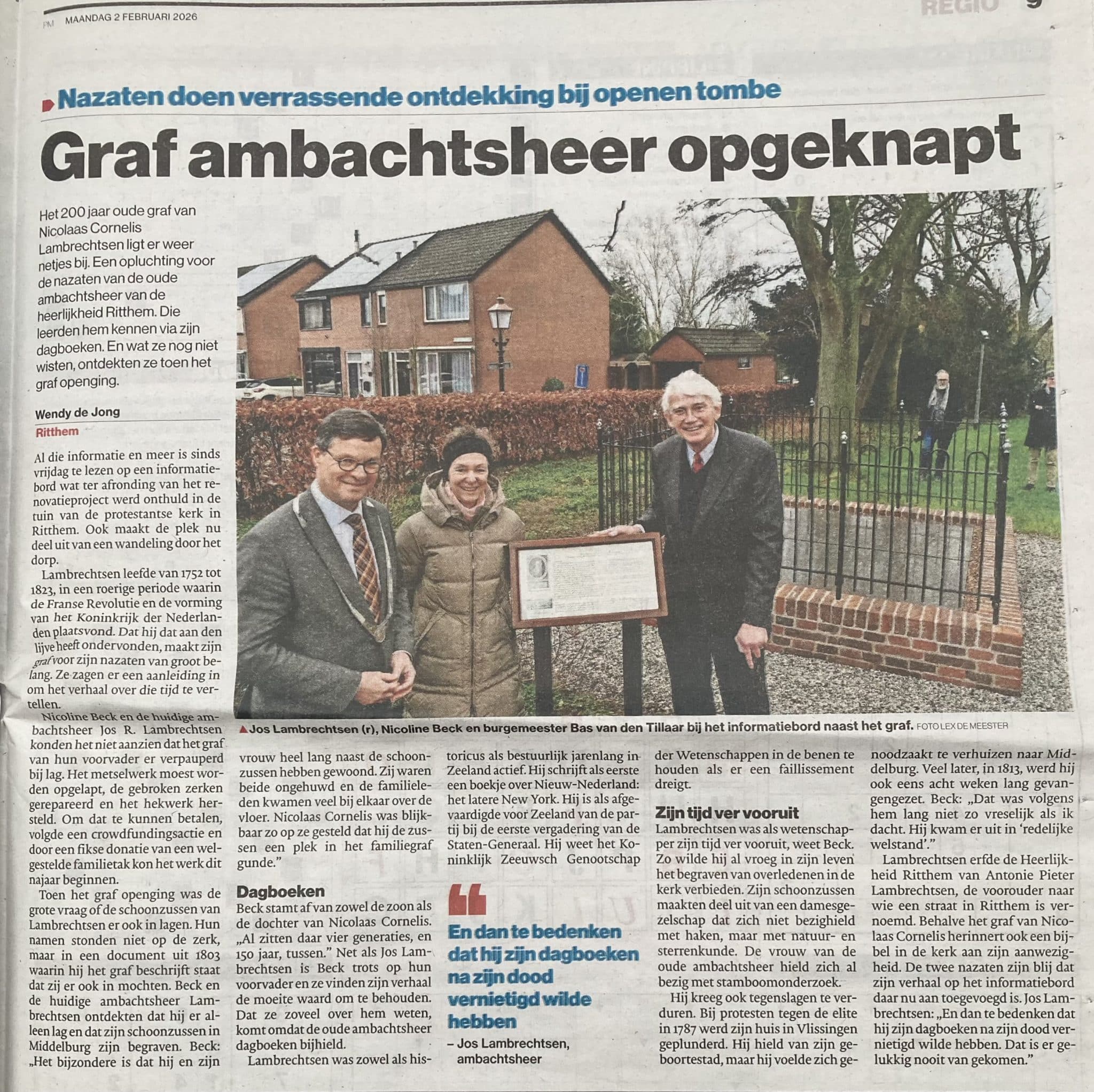 Vrijdag 30 januari was het dan zover. De afsluitende bijeenkomst voor de restauratie van het graf van Nicolaas Cornelis Lambrechtsen. Vooraf hadden we, Jos Lambrechtsen (de huidige ambachtsheer) en ik, zo’n 30 mensen verwacht. Uiteindelijk zijn er zo’n 60 mensen gekomen! In de kerk van Ritthem zaten leden van de familie Lambrechtsen, leden van het Hurgronjefonds, inwoners van het dorp en geïnteresseerden.